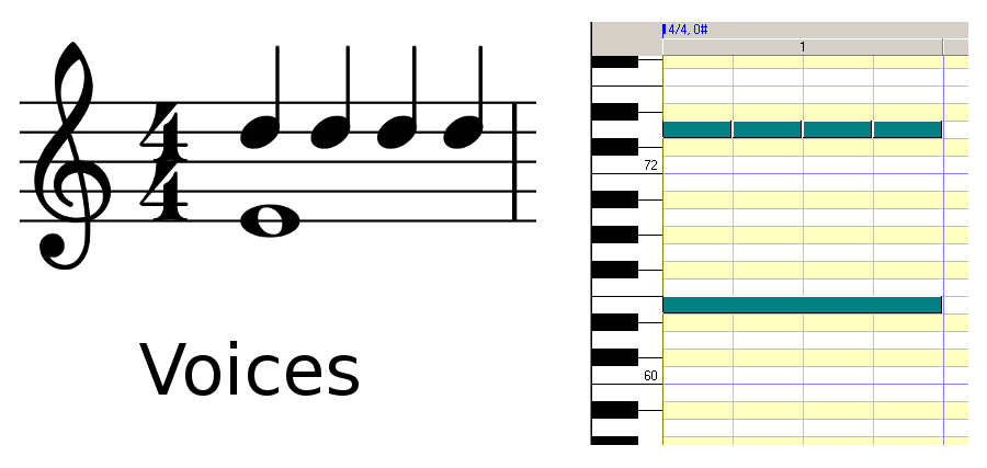Voices in music notation. Different voices are treated like layers in notation software, but are straightforward in a piano roll interface. (made with MuseScore and Sekaiju)
