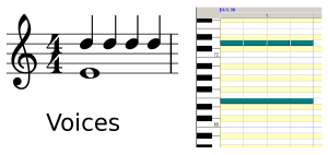 Another complexity in notation is voices (not to be confused with the human voice or instrumental timbre). What are voices? Imagine your right hand is on a piano keyboard. Each finger may play different notes at the same time, for the same duration, forming a chord. But it is also easy for each finger to play independently. So your thumb may play a whole note, and while that whole note is playing your index finger plays a succession of four quarter notes. How to notate this is seldom explained in beginner books as it may be confusing to look at, appearing to violate the conservation of time. In music notation software, voices are treated like layers in graphics software like Photoshop or GIMP. It will take several mouse clicks to go from one layer to another. In a piano roll interface, there is no concept of voices, making such note entry simpler.